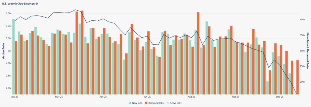 For the week ended January 3rd, job vacancies in the U.S. indexed daily directly from company and employer websites globally dropped 3.4%.